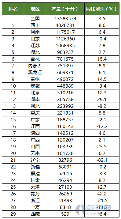 2016年全國白酒(折65度)總產量為135.84億升,同比上漲3.5%。其中四川省白酒年產量402.67萬千升,增長8.65%,位居全國第1位;河南省白酒產量117.50萬千升,增長6.4%,位居全國第2位;山東省白酒年產量112.64萬千升,下降0.4%,位居全國第3位。